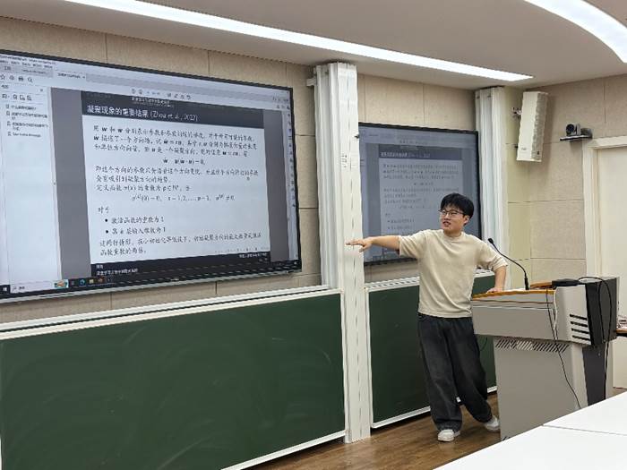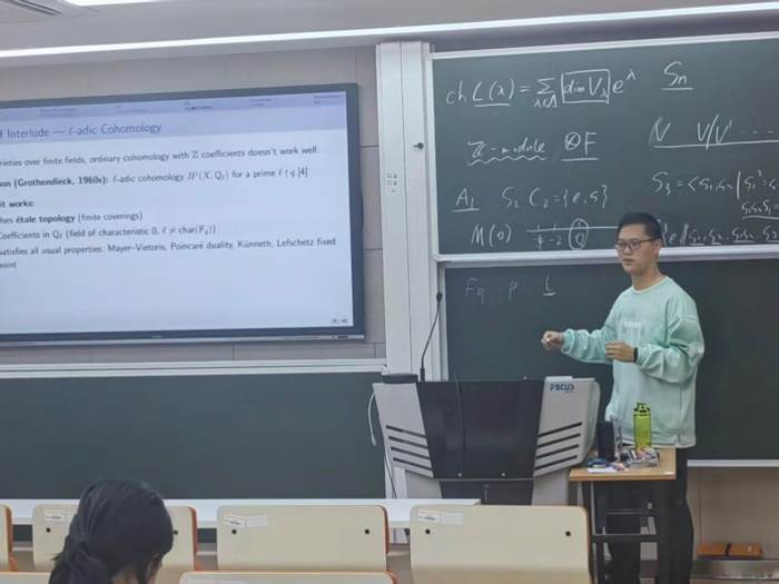 随后,色播 2024级拔尖班的肖倍达同学作了题为“Kazhdan-Lusztig Deligne-Lusztig: Geometry Meets Representation Theory”的报告。报告介绍了群和代数表示论中的Kazhdan-Lusztig和Deligne-Lusztig理论,阐述了两种理论如何分别从李代数表示和有限李型群表示的角度利用代数几何的语言来研究表示论的问题。