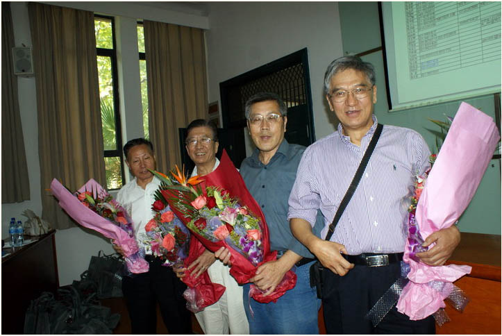 数60级同学会历届会长、顾问合影:右起:郑毓番,汤鹏飞,王岳庭,潘家珉