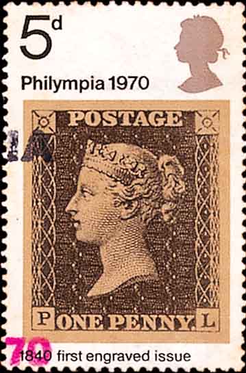 但在欧美早期邮票上的面值数额一般既不用罗马数码, 也不用印度-阿拉伯数码, 而是用英语中数词“ONE”、“TWO”等等. 图9邮票中的邮票是1840年英国发行的世界第一枚邮票, 面值1便士写成“ONE PENNY”, 这好像中国过去常用大写数字表示金融的数额一样, 以示慎重.