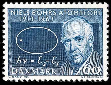 第四位是丹麦量子物理学家玻尔(Niels Henrik David Bohr,1885-1962,图5),1922年由于对原子结构理论的重大贡献而获得诺贝尔物理奖。邮票和明信片上分别显示按玻尔理论: 当氢原子在两个定态间跃迁时,以电磁波的形式放出或吸收能量,其频率的值ν,有: