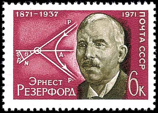 第五位是英国物理学家卢瑟福(Ernest Rutherford,1871-1937,图6是苏联纪念他诞生100周年而发行)。他通过α粒子为物质所散射的研究论证了原子的核模型, 把原子结构的研究引上了正确的轨道,因而他被誉为原子物理学之父。因为他在物理学上的成就同化学有关,而荣获1908年度诺贝尔化学奖。接受奖金后,卢瑟福发表了演说,他说,在他一生中, 曾经历过各种不同的变化,但最快的变化要算这一次了,他竟从物理学家一下子变成了化学家。