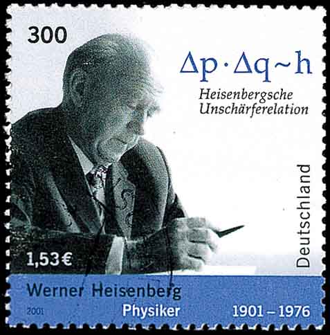 第六位是德国物理学家海森伯(Werner Heisenberg,1901-1976,图7)。海森伯是矩阵力学(量子力学)的创始者,以及它的应用导致了对氢的同素异形的发现。从而获得1932年诺贝尔物理学奖。 海森伯还证明原子穿过偏转所费的时间ΔT越长,能量测量中的不确定性ΔE就越小。再加上德布罗意关系λ=h/p,海森伯得到ΔEΔT~h,并且作出结论:“能量的准确测定如何, 只有靠相应的对时间的测不准量才能得到。”