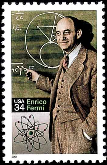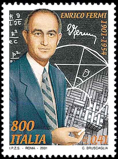 第七位是意大利出生的美籍物理学家费米(Enrico Fermi,1901-1954,图8、图9分别是美国和意大利纪念费米诞生100周年邮票)。他是1938年诺贝尔物理奖获得者。 1941年底,费米在哥伦比亚大学主持建造了世界上第一座原子反应堆,实现了自持式链式反应,为制造原子弹迈出了决定性的一步。图8、图9邮票是费米于1948年3月26日在芝加哥大学讲课程的画面, 从此我们不难看到费米在研究工作中对数学的应用。