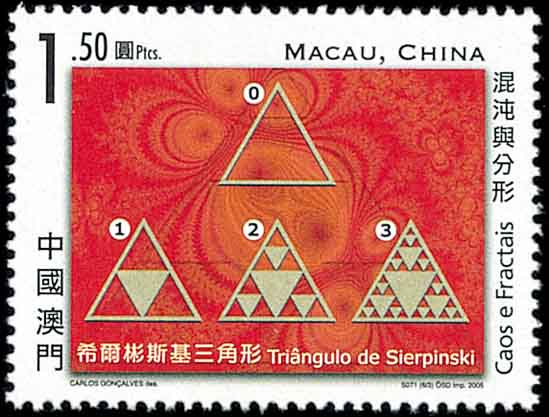 波兰数学家谢尔宾斯基(W. Sierpinski,1882-1969)于1915年提出一个有趣的例子,它是康托尔集的构思在二维平面的推广。它的操作方法是:先作一个正三角形(图6中的0),在这个正三角形内, 作4个相同大小的正三角形,如图6中的1那样挖去一个“中心黄三角形”,然后在剩下的3个小红三角形中各又挖去一个“中心黄三角形”(图6中的2)。这里红三角形是剩下的部分, 我们称红三角形为谢尔宾斯基三角形。谢尔宾斯基三角形的局部与整体是自相似的。如果用上面的方法无限地作下去(图6进行了3步),则谢尔宾斯基三角形的面积越趋近于零, 各个红三角形的周长亦趋近于无限大。