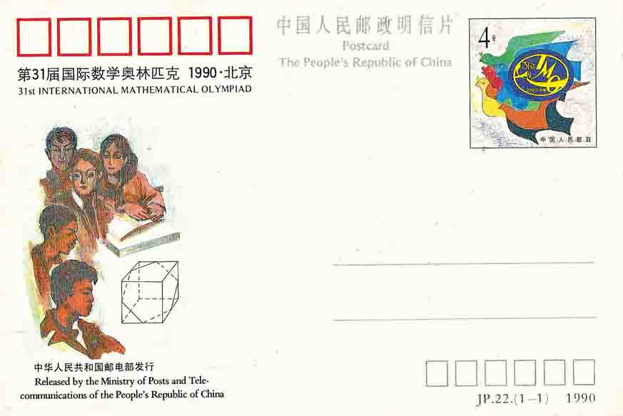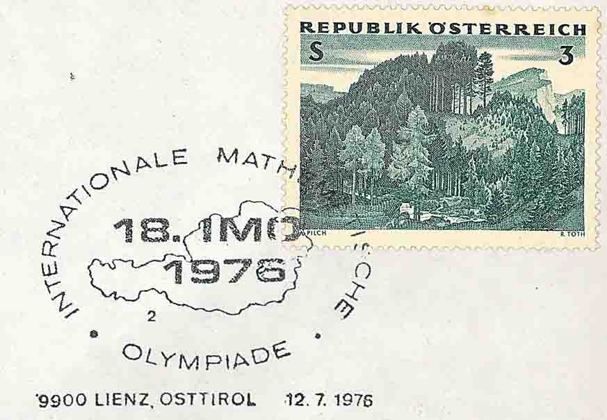 有几届主办国还发行了相应的邮品. 图 1 是 1976 年在奥地利举行第 18 届 IMO 时, 当地邮政刻制的纪念邮戳, 邮戳中央是奥地利的地图. 图 2 是 1990 年在中国举办第 31 届 IMO 时, 中国邮政发行的邮资明信片. 图 3 是 2000 年在韩国举办第 41 届 IMO 时, 韩国邮政发行的纪念邮票.