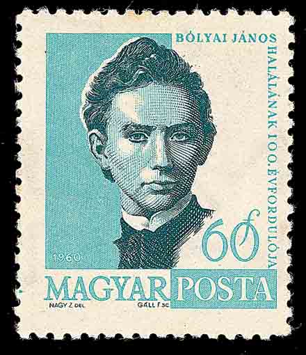 这时匈牙利青年数学家鲍耶·雅诺什 (Bolyai Janos, 1802-1860, 图 2 和图 3 分别是匈牙利和罗马尼亚在 1960 年为纪念鲍耶·雅诺什逝世 100 周年发行的邮票) 虽然遭到父亲 — 数学家鲍耶·法尔斯 (Bolyai Farkas, 1776-1856, 图 4 是匈牙利 1975 年发行的纪念鲍耶·法尔斯诞生 200 周年邮票) 的反对, 仍然致力于第五公设的研究, 终于发现了第五公设不可证明和非欧几里得几何学的存在, 并在 1823 年写成论文《空间的绝对科学》. 鲍耶·法尔斯将它寄给他的好朋友高斯, 希望得到他的赞许并公诸于世. 但高斯在赞扬雅诺什勇于探索精神的同时, 还说这与我 30 年前的工作不谋而合. 我无法夸奖他, 因为夸奖他就等于夸奖我自己. 这使鲍耶·雅诺什极为失望, 一直到 1832 年才在他的父亲的一本著作里, 以附录的形式发表这个研究成果. 但当他于 1840 年看到罗巴切夫斯基论文的德文版后就更加灰心丧气了.