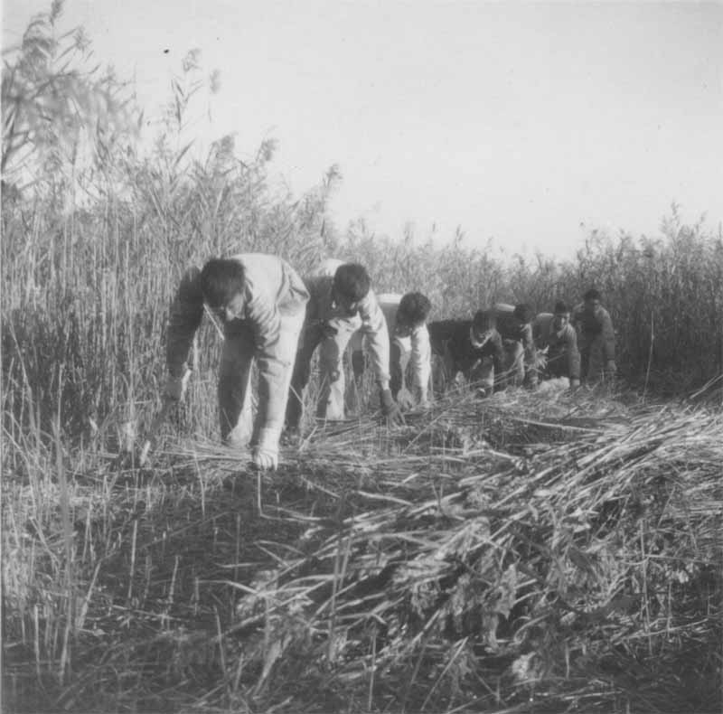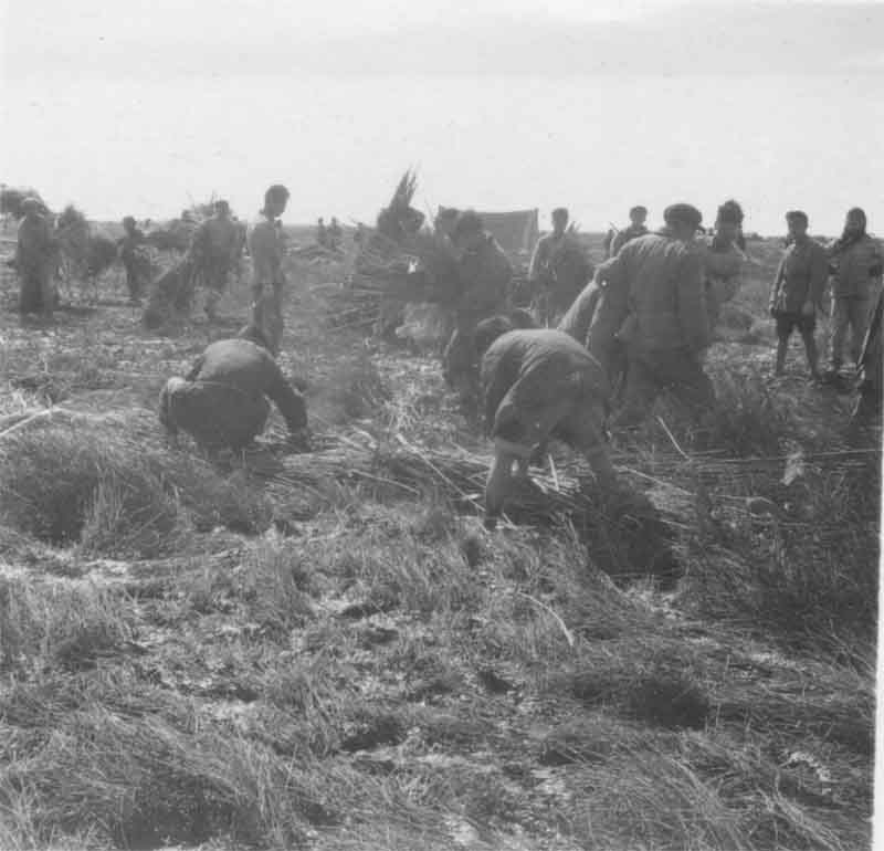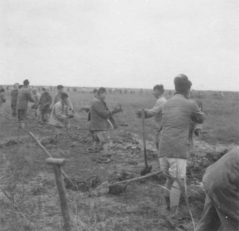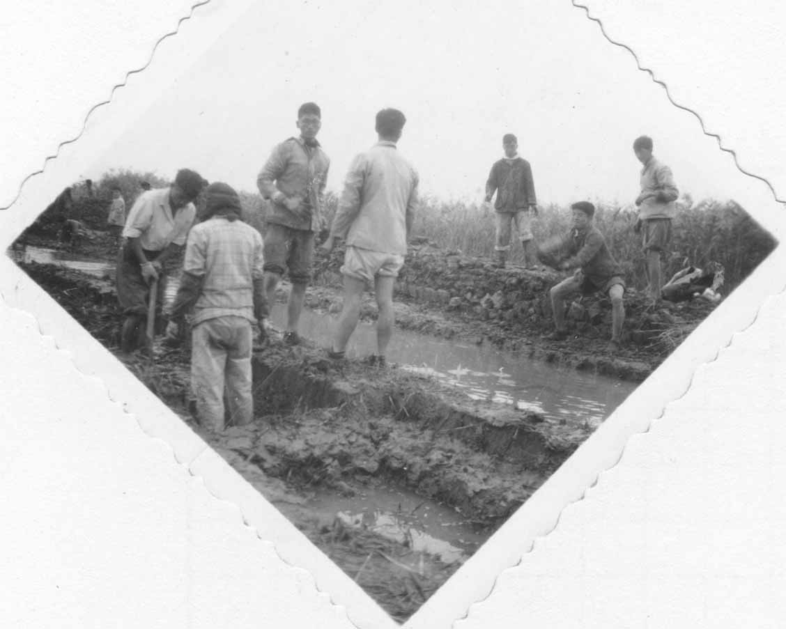 尽管大家吃不好,睡不稳,干起活来仍然生龙活虎,不甘人后。你看,先头部队在割芦苇,开出了我们上工的路,运回芦苇是搭棚的材; 你看,堤外取土的沟越挖越深,崇明滩在我们脚下,堤坝从无到有渐渐隆起,那就是后来可以开汽车的崇明农场大堤的雏形。