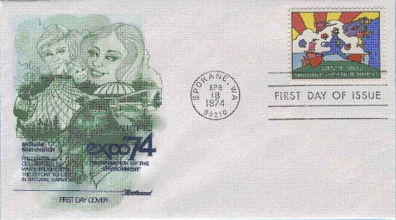 12.  1974年斯波坎环境世界博览会(专业)(1974/5/4—11/4,10国参加,参观者480万),图8是本届世博会纪念邮票及首日封。